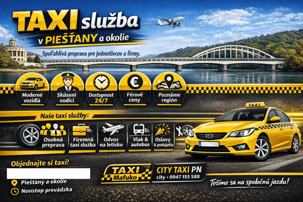 Ponúkame spoľahlivú taxi službu pre jednotlivcov aj firmy v meste Piešťany a širšom okolí. Naša taxi služba je ideálnym riešením pre každodennú prepravu, služobné cesty, odvoz na letisko, stanice, podujatia alebo bezpečný návrat domov.